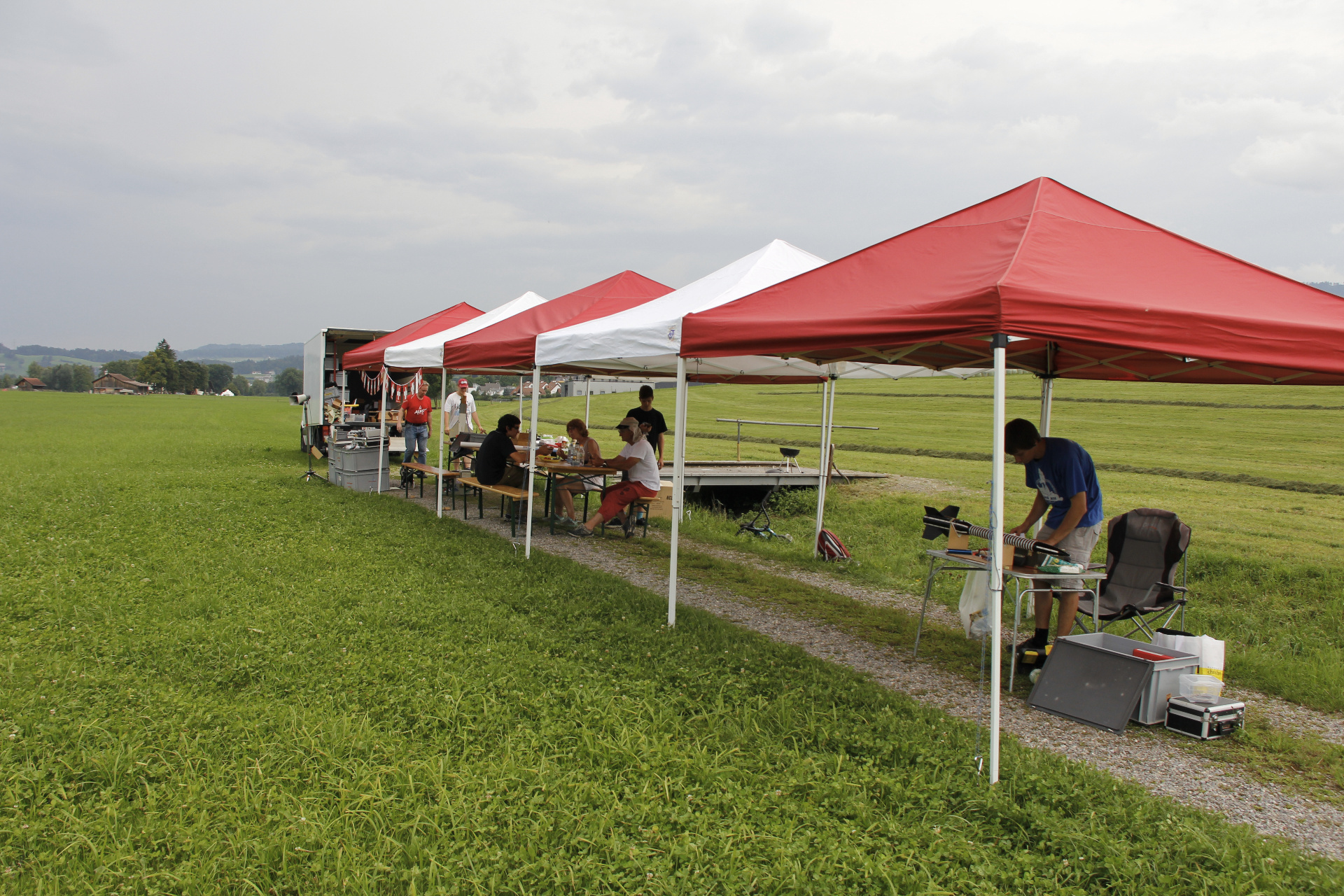 Mit tatkräftiger Stützung aller Anwesenden überlebte die Zeltburg diesen Ansturm unbeschadet und wir konnten anschliessend unsere Bäuche aus dem reichlichen Buffet vollschlagen. Leider traf dann eine zweite Gewitterfront ein, welche gemäss Lukas’ online Abklärung nur «wenig Regen» bringen sollte, welche aber lange im Talkessel hing und einen veritablen Föhnsturm auslöste. Diesem fielen sowohl der gesellige Teil, zwei Zelte wie auch alle Lampions und das Nachtfliegen zum Opfer.